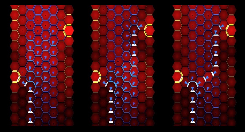 Most research on PIN-mediated patterning has focused on the model plant Arabidopsis thaliana (At). During organ initiation in Arabidopsis, PIN1 (AtPIN1) polarization is organized into convergent patterns that concentrate auxin into the local maxima required for organ initiation. Paradoxically, later in development, AtPIN1 polarity inverts, forming narrow channels of transport away from maxima during tissue patterning (B). We can computationally model these two polarization behaviors with two different positive feedback loops with respect to auxin. Convergent PIN patterns are formed by PIN polarization up-the-gradient (UTG), orienting towards the neighboring cell with the highest auxin concentration. While polarization away from the maxima is modeled with-the-flux (WTF), with PIN polarized in the direction of the greatest auxin efflux (Model visualization below). Understanding the molecular nature of these different polarization modes is integral to understanding how plants create positional information during development.